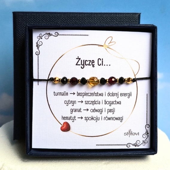 bransoletka ''Życzę Ci": bezpieczeństwa, bogactwa, pasji, spokoju - turmalin, cytryn, granat, hematyt