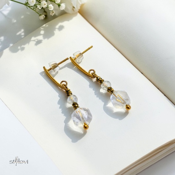 Delikatne, a jednocześnie przyciągające spojrzenia. Wykonane z naturalnego kryształu górskiego, kryształu górskiego galwanizowanego oraz błyszczącego hematytu w kolorze jasnego złota.