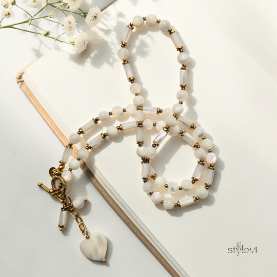 Połączenie masy perłowej i pozłacanego hematytu tworzy harmonijną całość – subtelną, a jednocześnie pełną klasy. Centralnym elementem jest serce z masy perłowej, symbol czułości i wewnętrznego ukojenia.