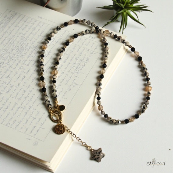 Długość ok. 45 cm sprawia, że naszyjnik delikatnie otula szyję, stając się codziennym talizmanem. Całość kończy dyndołek z gniecionej blaszki i gwiazdka z jaspisu dalmatyńskiego w złotej oprawie, przypominająca o Twoim wewnętrznym blasku i marzeniach.