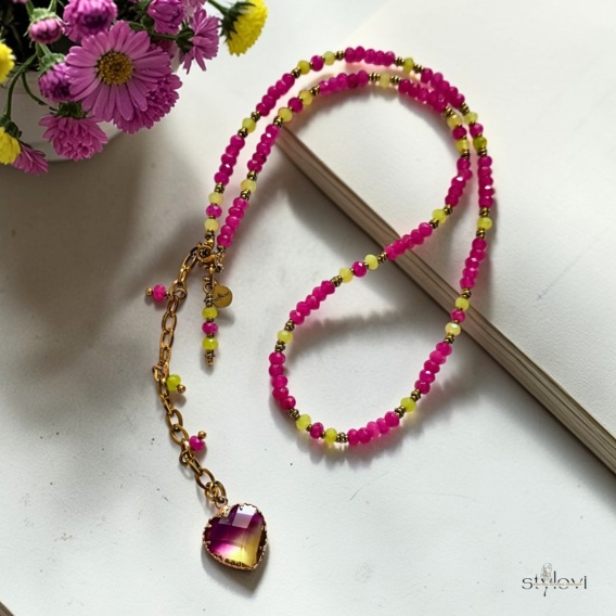 Wyrazisty naszyjnik w energetycznym połączeniu fuksji i soczystej zieleni. Kolorowe jadeity tworzą radosną, żywą kompozycję, którą podkreślają złote hematyty oraz dodatki ze stali szlachetnej.