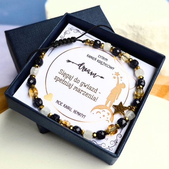 Bransoletka „Dream” łączy w sobie energię blasku i marzeń. Powstała z cytrynu, kamienia księżycowego i Nocy Kairu, ozdobiona maleńką, ażurową gwiazdką ze stali chirurgicznej oraz błyszczącymi przekładkami z hematytu. Całość tworzy subtelny, świąteczny talizman pełen światła.