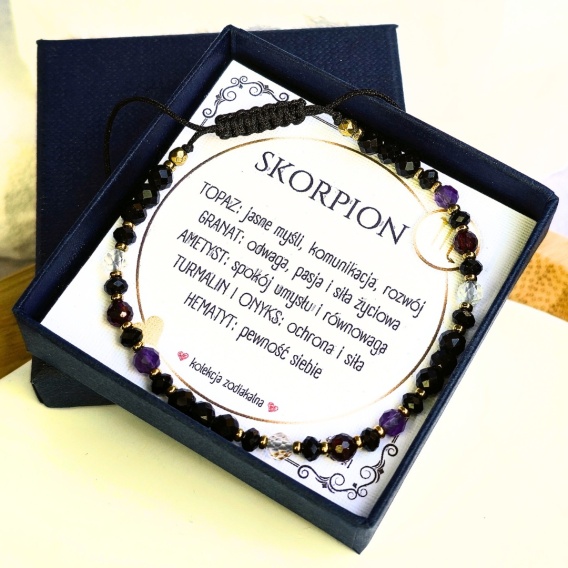 bransoletka - kolekcja zodiakalna - SKORPION - czarny turmalin, onyks, ametyst, granat, topaz, hematyt