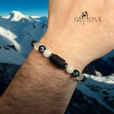 🤍 kryształ górski: 8 mm; 🖤 obsydian śnieżny: 8 mm; 🤍 kamień księżycowy: 8 mm; 🖤 onyks: 8 mm + wałek ze znakiem zodiaku; ⚡ hematyt: 6 i 8,5 mm;