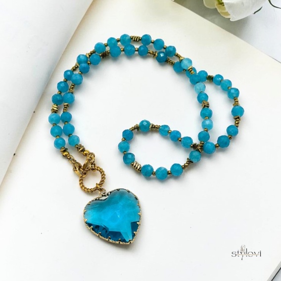 Centralnym punktem jest wyjątkowe, turkusowe szklane serce (ok. 30 × 28 mm) w złotej oprawie z miedzi. Przyciąga spojrzenie i pięknie odbija światło, dodając całości świeżości i elegancji.